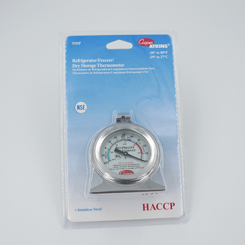 The 25HP HACCP Professional Refrigerator/Freezer thermometer hangs or stands. It features a HACCP reference dial and is NSF listed.