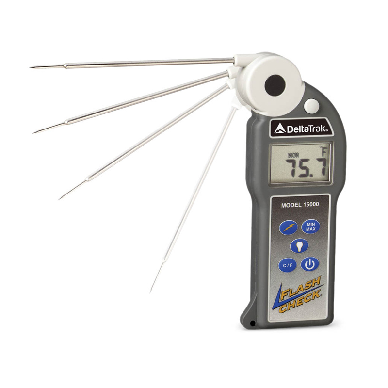 DeltaTrak’s FlashCheck Folding Probe Thermometer, Model 15000, can measure temperatures from room temperature to 0 ° C in just 30 seconds. For safety, the 112mm long sharp probe can be folded. Its water resistance rating is IP67. The rubber casing protects the thermometer against accidental drop impacts of up to 6 feet. This durable thermometer contains a minimum/maximum temperature signature.
